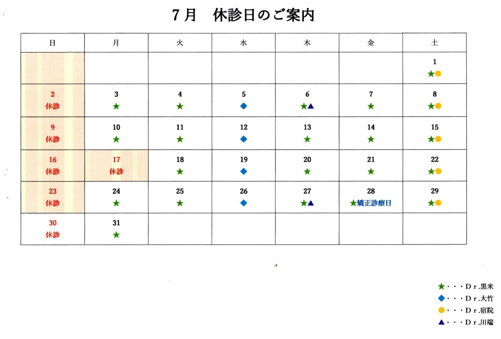 7月の休診日および矯正診療日をお知らせいたします。